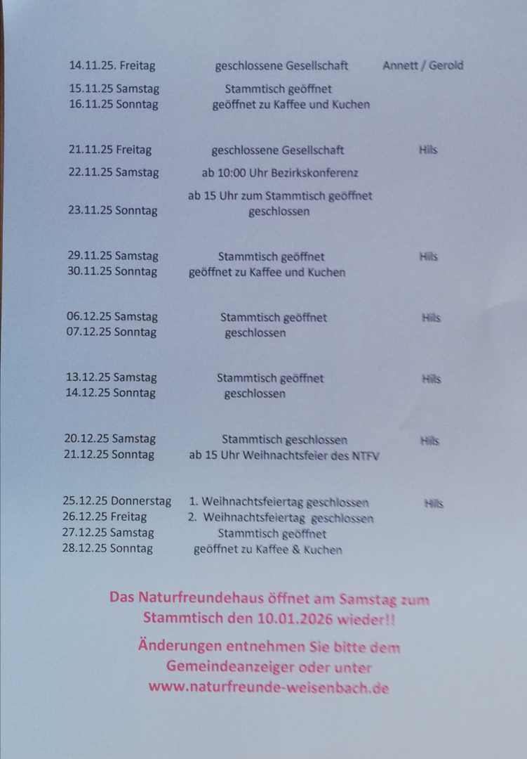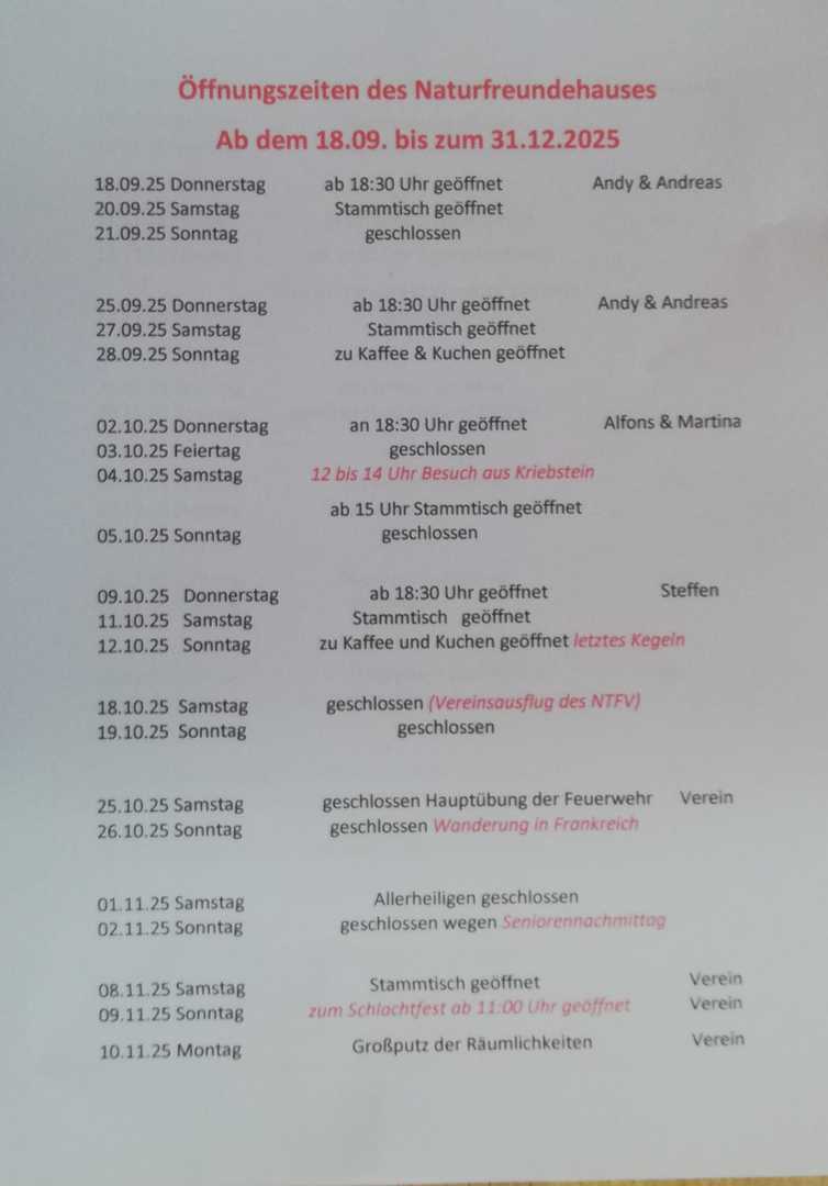 Öffnungszeiten des Naturfreudehauses vom 18.09 bis 31.12.2025